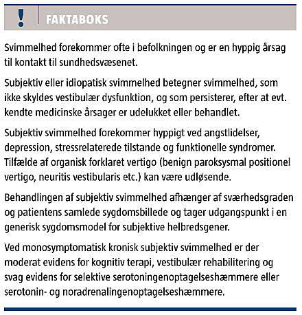 symptom behandles efter gældende retningslinjer. Ved monosymptomatisk kronisk subjektiv svimmelhed bruges selektive serotoningenoptagelseshæmmere hyppigt i specialiserede settings [4], men der mangler større velgennemførte kliniske randomiserede undersøgelser til vurdering af effekten af selektive serotoningenoptagelseshæmmere eller serotonin- og noradrenalingenoptagelseshæmmere [29, 30]. Ift. medicinsk behandling af vertigo henvises til relevante artikler i dette temanummer.