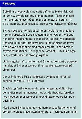 Subklinisk hypotyroidisme (SH) er en tilstand, der defineres biokemisk ved serumthyroideastimulerende hormon (S-TSH) over laboratoriets øvre referenceområde, mens estimater af frit thyroxin (fT4) i serum er normale. SH forekommer i Danmark hos omkring 2% af befolkningen blandt andet afhængigt af jodindtag. Tilstanden er hyppigere hos kvinder end hos mænd (i forholdet ca. 4:1) og hyppigere des ældre, man bliver. I Danmark er forekomsten af SH hos kvinder mellem 60-65 år omkring 8% og hos mænd i samme aldersgruppe 2% [1]. SH ses formentlig altid som et overgangsfænomen inden udvikling af manifest kronisk autoimmun tyroiditis med lavt S-T4 og højt S-TSH. Nogle patienter med autoimmun tyroiditis kan imidlertid have SH i årevis inden progression. SH kan også ses ved en række andre tilstande: mangelfuld hormonsubstitution ved hypotyroidisme, ved antityroidbehandling (medikamentel behandling, radioaktiv jodbehandling, kirurgi) tidligere bestråling af glandula thyroidea og ved behandling med medikamenter, der hæmmer thyroideafunktionen.