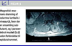 Lumbal punktur viste klar spinalvæske med leukocytose (406/l), men uden vækst af bakterier. Der blev opstartet bredspektret antibiotisk behandling med G-penicillin og ceftriaxon. Epiduralkateteret blev fjernet og sendt til dyrkning, som var negativ. Der blev foretaget magnetisk resonans (MR)-skanning, som viste en subkutan ansamling fra L1-L5 og i den omkringliggende muskulatur uden forbindelse til spinalrummet (Figur 1 ).