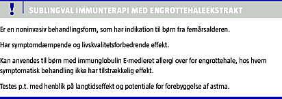 Allergisk rinokonjunktivitis forekommer hos 6-10% af skolebørnene og 15-20% af de større børn og unge [1]. Subkutan, specifik immunterapi (hyposensibilisering og allergivaccination) har i mange år været en effektiv behandlingsmulighed [2]. Specifik immunterapi er den eneste behandling, som har potentiale til at påvirke sygdommens naturlige forløb [3, 4]. Subkutan immunterapi er imidlertid en invasiv behandlingsform, der kræver klinikbesøg hver 6.-8. uge i ca. tre år. På grund af en lille risiko for anafylaktiske reaktioner udføres behandlingen under akut anafylaksiberedskab af læger med uddannelse og erfaring hermed [5]. Der har derfor været interesse for udvikling af et noninvasivt immunterapeutisk behandlingstilbud, og inden for de seneste år er der udviklet sublingvale administrationsformer til behandling af bl.a. pollen- og husstøvmideallergi. I Danmark findes indtil videre kun et produkt til sublingval immunterapi på markedet. Dette indeholder græspollenekstrakt fra engrottehale (Phleum pratense ) og har siden januar 2009 været registreret til anvendelse hos børn fra femårsalderen [6].