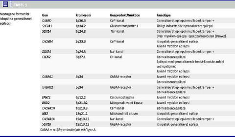 Cirka 0,3% af befolkningen lider af IGE, som udgør ca. 30% af alle epilepsier. IGE er i dag karakteriseret ved en aldersrelateret debut af gentagne uprovokerede generaliserede anfald (absencer, myoklonier, toniske og tonisk-kloniske anfald), karakteristiske elektroencefalogramforandringer (generaliserede spikes, polyspikes eller spike/polyspike waves iktalt eller interiktalt) og med en formodet genetisk baggrund. Det vil sige, at epilepsien er et direkte resultat af kendte eller formodede genetiske defekter, hvor anfald er kernesymptomet i tilstanden. De mest hyppige former for IGE er børneabsenceepilepsi (CAE), juvenil absence-epilepsi (JAE), juvenil myoklon epilepsi (JME) og epilepsi med generaliserede tonisk-kloniske anfald (EGTCS). Patienter med IGE responderer sædvanligvis godt på relevante antiepileptika, men behandlingen vil kunne være livslang. Flere gener er inden for de senere år identificeret som årsag til specifikke former for IGE (Tabel 1 ), ligesom mange prædisponerende områder på det humane genom er påvist.