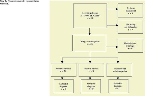 Der var tale om både ambulante og indlagte patienter. Dataindsamling blev foretaget ved behandlingsstart, og inklusionskriterierne var, at patienterne opfyldte I nternational Classification of Diseases (ICD) 10-kriterier for en spiseforstyrrelse (ED), dvs. AN (F 50.0, F 50.1), BN (F 50.2, F 50.3) eller uspecificeret ED (F 50.9). Patienterne kunne ikke indgå i undersøgelsen, såfremt de var ude af stand til at udfylde spørgeskemaer eller var mentalt retarderede.