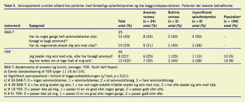 Materiale og metoder: Data blev indsamlet i forbindelse med en europæisk multicenterundersøgelse vedrørende spiseforstyrrelser. Syvogtredive patienter (12-17 år, medianalder 15 år), der var henvist til Center for Spiseforstyrrelse, Odense Universitetshospital, indgik i denne opgørelse. Forekomsten af suicidal adfærd hos den enkelte blev vurderet ud fra et lægeadministreret interview, Bedømmelse af anoreksi og bulimi, teenager og et spørgeskema udfyldt af den unge, Youth Self Report.