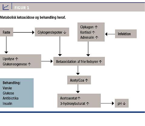 Ved faste har leveren et glykogenlager, der svarer til basalmetabolismens energiforbrug i ca. et døgn. Efter flere døgns faste vil kroppens energiforsyning til vitale væv, såsom hjernen, være en kombination af leverens produktion af ketonstoffer fra betaoxidation af fedtsyrer (~ 150 g/døgn) og glukose fra glukoneogenesen (~ 80 g/døgn) [3]. Ved kulhydratindtagelse på mindre end ca. 40 g/døgn vil kroppen mobilisere energi fra fedtvævet ved lipolyse og dermed produktion af ketonstoffer. Ved akut infektion som hos patienten i sygehistorien vil der ud over en akut insulinresistens være en stigning i frigivelsen af adrenalin, kortisol og glukagon og dermed en yderligere øgning af ketonstofdannelse.