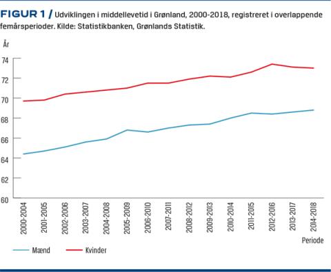 Middellevetiden i Grønland har i en længere årrække været stigende for både mænd og kvinder. I perioden 2014-2018 var middellevetiden for kvinder steget til 73 år og for mænd til knap 69 år [1]. Det er en stigning på ca. fire år for kvinder og fem år for mænd inden for en periode på under 20 år (Figur 1). Der har således været en markant positiv udvikling i sundhedstilstanden målt på denne parameter. Globalt set er den grønlandske middellevetid lige under gennemsnittet af den estimerede gennemsnitlige middellevetid for hele verdens befolkning på ca. 72 år [13]. Den svarer til middellevetiden i f.eks. Rusland og er langt under middellevetiden i Norden. Den lavere middellevetid i Grønland kan tilskrives en relativt høj kræftdødelighed, andre livsstilsrelatererede sygdomme, selvmord og en relativt høj ulykkesfrekvens. Kræftforekomsten er i dag helt domineret af de samme kræftformer, som ses i den industrialiserede verden: lungekræft, tyk- og endetarmskræft, brystkræft, livmoderhalskræft og prostatakræft [14].