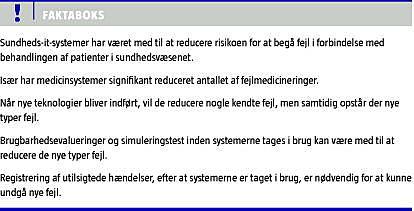 Summary Relations between health information systems and patient safety Ugeskr Læger 2012;174(45):2773-2775 Health information systems have the potential to reduce medical errors, and indeed many studies have shown a significant reduction. However, if the systems are not designed and implemented properly, there is evidence that suggest that new types of errors will arise - i.e. technology-induced errors. Health information systems will need to undergo a more rigorous evaluation. Usability evaluation and simulation test with humans in the loop can help to detect and prevent technology-induced errors before they are deployed in real health-care settings.