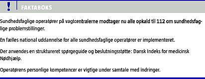 Vagtcentralerne i Danmark er nu blevet bemandet med sundhedsfaglige operatører, der fra maj 2011 modtager alle alarmopkald via alarmcentralen ved 112-opkald vedrørende sundhedsfaglige problemstillinger. Dette initiativ er iværksat, således at den faglige viden og en systematisk udspørgen kan føre til en hurtigere genkendelse af symptomer ud fra indringers forklaring og dermed bedre triage af patienterne [5].