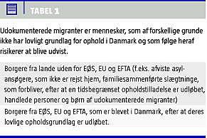 Det anslås, at der befinder sig 1.000-5.000 migranter uden gyldig opholdstilladelse i Danmark, heraf opholder størstedelen sig i landet ulovligt, de er i det følgende benævnt udokumenterede migranter (Tabel 1 ). En stor del er sandsynligvis afviste asylansøgere, som lever »under jorden« [1]. Udokumenterede migranter er ikke dækket af Den Offentlige Sygesikring eller Asylcentrenes sundhedstilbud. Ofte opsøger de ikke hospitaler eller andre sundhedstilbud af frygt for at blive overdraget til politiet, eller fordi de har en formodning om at skulle betale for sundhedsydelser [2]. Det er et problem for den patient, der får ingen eller i bedste fald tilfældige muligheder for behandling. Også samfundsmæssigt er det problematisk, hvis smitsomme sygdomme som f.eks. tuberkulose eller hepatitis B ikke bliver behandlet.
