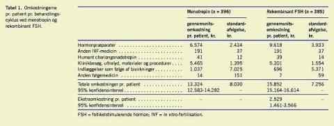 Det ses af Tabel 1 , at de totale omkostninger for den gennemsnitlige patient er lavere ved brug af menotropin end ved brug af rekombinant FSH. Forskellen er på 2.529 kr. (95% konfidensinterval: 1.461-3.566) - den pris det koster ekstra pr. patient at benytte rekombinant FSH i dag.