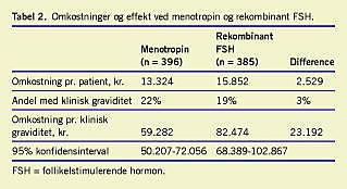 Materiale og metoder: I en prospektiv omkostningseffektivitetsanalyse (i sundhedssektorperspektiv) blev menotropin og rekombinant FSH sammenlignet. Forskelle i omkostninger blev sammenholdt med forskelle i effekter (klinisk graviditet).