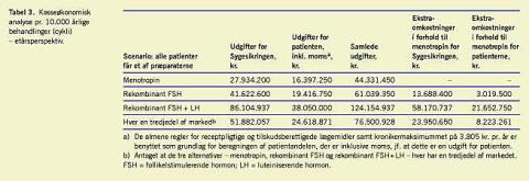 Som det fremgår af Tabel 3 er de samlede medicinudgifter ved at vælge menotropin lavere end de tilsvarende udgifter til rekombinant FSH. Den potentielle årlige besparelse er på 16 mio. kr., hvis alle vælger menotropin, mens den årlige besparelse er på hele 80 mio. kr., hvis menotropin erstatter rekombinant FSH + LH.
