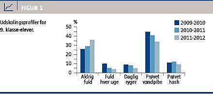 Resultaterne for skoleårene 2010-2011 og 2011-2012 er sammenholdt med Den fælleskommunale sundhedsprofil for skoleåret 2009-2010 [3] (Figur 1). Der ses et fald i forbruget af alkohol, tobak og vandpibe og et lille fald i forbruget af hash i løbet af de tre skoleår.