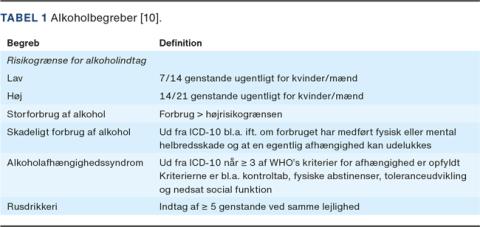 Danskernes indtag af alkohol har store konsekvenser for folkesundheden; ca. 3.000 årlige dødsfald – svarende til 6% af alle dødsfald – kan relateres til alkohol, som enten den primære eller den sekundære dødsårsag [1]. I tillæg hertil kan indtagelse af alkohol påvirke risikoen for udvikling af ca. 230 ICD-10-klassificerede tilstande og sygdomme [2]. Det gælder bl.a. flere former for kræft (f.eks. i lever, mundhule og svælg), levercirrose og hypertension [1]. Risikoen for at udvikle en alkoholrelateret sygdom øges afhængigt af den mængde alkohol, der indtages [3]. Derudover kan et stort forbrug af alkohol have personlige og økonomiske konsekvenser for den, der drikker, men også for de pårørende, ligesom det har betydelige samfundsøkonomiske konsekvenser [1].