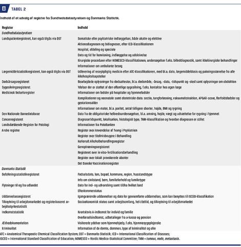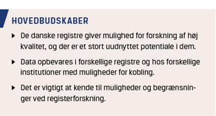 I Danmark er der en stolt tradition for udarbejdelse af registerforskning, hvilket er forskning på data, der er indsamlet i forbindelse med ikkeforskningsrelaterede begivenheder som f.eks. indlæggelser, receptudleveringer eller dødsfald. Dansk registerforskning er bl.a. muliggjort af vores unikke CPR-nummersystem, etablering af sygdomsregistre, landsdækkende og nærkomplette indsamlinger af administrative data og kliniske databaser igennem mange år samt muligheden for at tage højde for immi- og emigration, død og andre former for censurering [1-6]. De danske registre er beskrevet i adskillige publikationer [3-12]. Mange er validerede på nøglevariable og population, og de anses generelt som værende troværdige, til trods for at der stadig er problemer med misklassifikation og ukomplette data i