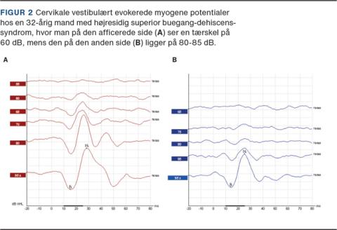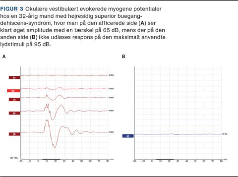 Ved SCDS er resultaterne af disse test ofte abnorme, da det afficerede øre er specielt sensitivt over for auditoriske eller vibratoriske stimuli, som bruges til frembringelse af myogene potentialer. Patienter med SCDS har typisk lavere tærskler end normalt ved cervikal VEMP (Figur 2), men højere amplitude end normalt ved okulær VEMP (Figur 3). Det er beskrevet, at især okulære VEMP-amplituder er sensitive og specifikke for diagnostik af en intraoperativt bekræftet dehiscens. Dermed er VEMPs en vigtig del af diagnostikken ved SCDS [3].