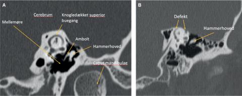 Ved højopløsnings-CT vil man hos denne patientgruppe kunne identificere en knogledehiscens af den superiore buegang. Snittykkelsen skal ifølge Ward et al være tynd, dvs. ≤ 0,625 mm og bør være i planet for den superiore buegang (Pöschls view) samt ortogontalt til denne (Stenvers view) [3]. I Danmark ønskes en CT evt. en cone beam-CT med snittykkelse på 0,2 mm inden henvisning til vurdering af et evt. kirurgisk behandlingstilbud. En dehiscens på CT’en alene er dog ikke diagnostisk, hvorfor patienten også skal have andre symptomer, der er forenelige med syndromet.