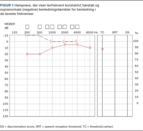 Ved rentoneaudiometri vil en benledningstærskel, som er bedre end normalt og ofte er negativ i de lave frekvenser, der er associeret med en normal eller eleveret luftledningstærskel, afsløre et konduktivt høretab, der er typisk for SCDS (Figur 1). Normal symmetrisk hørelse kan udelukke anden retrokokleær årsag til vertigo, såsom vestibularisschwannom. Stapediusrefleksen er som oftest bevaret ved SCDS, hvilket differentialdiagnostisk kan bruges til udelukkelse af otosklerose, hvor stapes vil være fikseret og uden stapediusrefleks [3].