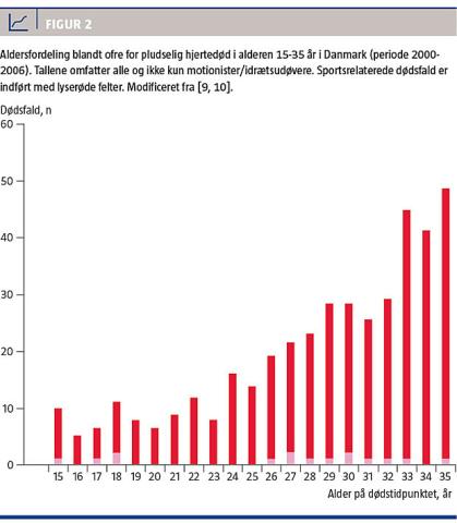 Pludselig død under udøvelse af sport er meget sjældent hos både unge konkurrenceidrætsudøvere (Figur 2) og supermotionister [9]. I forbindelse med maratonløb ses en forekomst på 0,75 dødsfald pr. 100.000 deltagere [11]. Hos personer under 30 år skyldes dødsfaldene som regel ukendt, arvelig hjertesygdom (f.eks. kardiomyopati, ionkanalsygdomme og koronararterieanomalier), og for personer over 30 år er iskæmisk hjertesygdom den hyppigste dødsårsag. Selvom der generelt er en kortvarig øget risiko for pludselig død under selve udfoldelsen af hård fysisk træning på grund af det akutte kardiovaskulære stress, opvejes denne risiko af de positive langvarige effekter af regelmæssig træning, som fører til en markant reduceret samlet risiko for sygdom og død. Forebyggelsesmæssigt er det vigtigt at reagere på eventuelle kardiale symptomer. En nyligt publiceret dansk undersøgelse viste, at ca. 50% af unge ofre for pludselig hjertedød havde symptomer op til den fatale hændelse [9]. Brystsmerter, uforventelig åndenød, besvimelse, nærbesvimelse og svimmelhed kan være udtryk for en underliggende hjertesygdom,