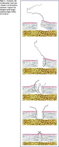 Nålen føres vinkelret gennem huden, normalt mindre end 5 mm fra kanten, samtidigt med at den dybe dermis og subcutis støttes opefter med pincetten. Nåleføringen med nålespidsen vinkelret på huden kræver, at håndleddet roteres fra kraftig pronation til supination. I den anden sårlæbe laves rotationsbevægelse fra indre sårlæbe, mens øvre dermis skubbes lidt væk og løftes. Den »pæreformede« sutur trækker subcutis og dybe dermis indefter og opad. Herved lukkes hulrum, og hudkanterne everteres (Figur 1). Hvis dette gøres korrekt, er everterende tilbagesting normalt ikke nødvendige. Hvis man ikke everterer epidermis, anvender mange en vertikal madrassutur for at løfte hudkanterne mod hinanden. Ved enkeltsutur kan man ved hver sutur foretage individuel nøjagtig approksimation, hvilket kan være at foretrække og er nødvendigt, hvor forskellige dele af et sår kræver forskellig tension og approksimation. Ved mere ensartede sår kan en fortløbende sutur anvendes.