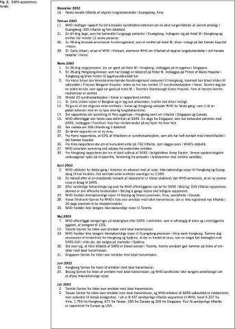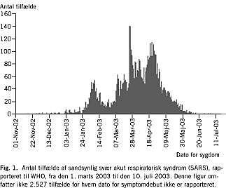 Svær akut respiratorisk syndrom er en atypisk pneumoni forårsaget af SARS-coronavirus (SARS-CoV). Siden november 2002 er der rapporteret om 8.437 sandsynlige tilfælde fra 30 lande, dog ingen fra Danmark (Fig. 1 ). Den 5. juli 2003 meddelte WHO, at smittekæden var brudt i det sidste endemiske område, Taiwan (Fig. 2 ). Ingen sygdom er tidligere kortlagt så hurtigt som SARS. WHO's indsats og det internationale samarbejde er værd at fremhæve. Kommunikation med e-mail, publikationer på sundhedsinstitutioners og videnskabelige tidsskrifters hjemmesider samt etablerede laboratorienetværk var afgørende i den internationale vidensdeling. Trods dette var det de klassiske principper i epidemibekæmpelse, isolation og karantæne, som fik epidemien under kontrol og til sidst inddæmmet.