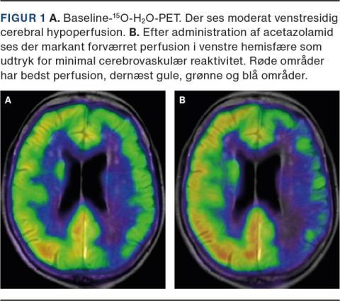 Kronisk cerebral hypoperfusion opstår typisk som følge af svære aterosklerotiske stenoser og okklusioner i de store cerebrale og præcerebrale arterier og udgør en risiko for iskæmisk apopleksi [1-3]. Tilstanden skyldes hypoperfusion af hjernevævet i de afficerede arteriers forsyningsområde, oftest a. carotis internas eller a. cerebri medias. Symptomerne inkluderer forbigående, men gentagne, hemiforme, rystende bevægelser, såkaldt limb-shaking transitorisk iskæmisk attak (TIA), pareser og afasi, som ofte er ortostatisk udløst [1-3]. Pga. den stereotype anfaldskarakter bliver limb-shaking TIA ofte fejldiagnosticeret som fokal epilepsi [1-3]. For at bekræfte diagnosen skal patienten ud over en relevant karokklusion eller -stenose, som typisk påvises ved CT- eller MR-angiografi, eller halskar-Dopplerundersøgelse [3], have påvirket cerebral hæmodynamik i det afficerede kars forsyningsområde [3]. Ved bestemmelse af den regionale cerebrovaskulære reaktivitet (CVR) kan graden af hæmodynamisk reservekapacitet fastslås [3]. Flere billeddiagnostiske modaliteter kan bruges som screening: transkraniel Doppler (TCD) og 99mTc-exametazim-SPECT med acetazolamid, mens 15O-H2O-PET med acetazolamid for nuværende er den eneste metode i Danmark, hvormed man kan kvantificere CVR [3, 4].