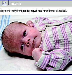 Ved indlæggelsen havde pigen tabt sig 921 g, svarende til 30% af fødselsvægten. Objektivt var hun sløv og mager og havde tørre slimhinder. De sidste 3-4 dage havde hun ikke spist ret meget og faldt hyppigt i søvn ved brystet, vandladningerne var blevet meget sparsomme. Paraklinisk blev der fundet svær hyperton dehydrering med natrium 187 mmol/l, kalium 5,5 mmol/l, kreatinin 352 mikromol/l, karbamid 76,8 mmol/l og hæmoglobin 12,9 mmol/l. Infektionstal og bilirubinniveau var normale.