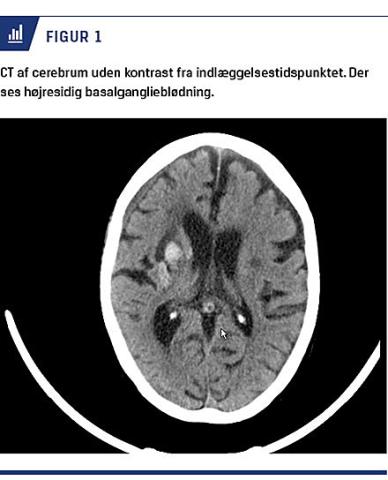 Ved indlæggelse viste en CT af cerebrum en sandsynligvis hypertensionsbetinget hæmoragi i mesencefalon med involvering af højre basalganglieområde og thalamus (Figur 1).