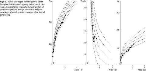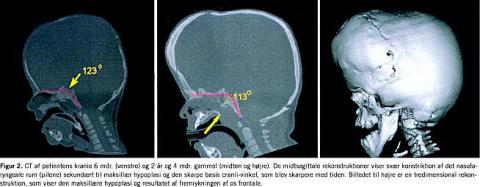 Ved natlig måling fandtes mere end 450 desaturationer over 4% (næsten en pr. minut, mange af dem til under 70%, men der sås ikke kuldioxidretention. Der forekom adskillige opkastninger. Patienten blev den efterfølgende nat sat i behandling med 12 cm continuous positive airways pressure (CPAP), hvorved luftvejen blev holdt åben under in- og eksspiration. Efter fire nætter var patienten tilvænnet behandlingen, og saturationskurven var stort set normaliseret. Ved et kontrolbesøg tre uger senere var patienten - fra at være sløvt siddende i en stol, appetit- og glædesløs - fuldstændig ændret til et barn, som løb op og ned ad gangen, nysgerrig og legende. Vækst- og vægtkurver (Figur 1 ) bekræftede, at barnet atter var i trivsel. Der var i alderen 6 mdr. og to år blevet foretaget to CT'er for visuelt at erkende pladsforholdene i fossa cranii og næse-svælg-rummet (Figur 2 ). Det forventes, at patienten ad åre vil blive bedre, efterhånden som luftvejsdimensionerne øges ved resorptiv sænkning af næsebunden [3], men især ved operation på maksillen med fremrykning af denne senere i vækstforløbet (5-6-års-alderen) [4].