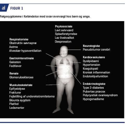 Det er påvist, at op mod 50% af danske børn med svær overvægt og en gennemsnitsalder på 11,5 år ved behandlingsstart havde begyndende eller reelt forhøjet blodtryk, 31% havde fedtlever, 27% havde dyslipidæmi, 45% havde søvnapnø og 14% havde prædiabetes [10-12]. De autoritative amerikanske anbefalinger, der er udfærdiget af en stor gruppe af internationale eksperter, har klassificeret og beskrevet 20 komplikationer i forbindelse med svær overvægt hos børn og unge [13] (Figur 1). Ubehandlet vil mange børn med svær overvægt have en tilbøjelighed til at forblive svært overvægtige som voksne [14] med en deraf følgende øget risiko for udvikling af hjerte-kar-sygdomme, diabetes og mere end 20 forskellige former for cancer, der tilsammen øger morbiditeten og mortaliteten og reducerer levelængden [15-18].