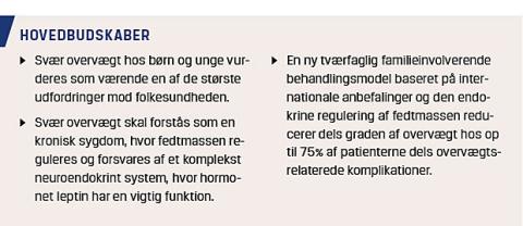 Det er tvingende nødvendigt, at der sker en ændring i opfattelsen og forståelsen af svær overvægt som en sygdom, så både samfund og sundhedsfaglige forstår, at man kan og skal behandle svær overvægt for at sikre sundhed og trivsel i befolkningen. Svær overvægt er en kronisk kompliceret sygdom, hvor fedtmassen reguleres af et effektivt og energibevarende hormonsystem. Internationale behandlingsresultater baseret på selekterede patienter har traditionelt set været ringe, hvad angår både effektivitet og komplians. Med nye behandlingsresultater har man opnået vægttab hos op til 75% af uselekterede patienter med et årligt tidsforbrug på under fem timer sundhedsfaglig tid pr. barn, og også det forhøjede blodtryk, kolesterolkoncentrationer, fedtlever, visceralt fedt samt forældreovervægt reduceredes, og livskvaliteten forbedredes. Det vurderes, at uden en effektiv behandling på tværs af sundhedssektorer vil morbiditeten og mortaliteten i voksenalderen forårsaget af svær overvægt og de relaterede komplikationer være en af de største trusler mod folkesundheden.