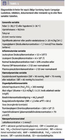 Sepsis defineres som tilstedeværelse (sandsynlig eller dokumenteret) af en infektion med påvirket almentilstand i form af feber, takykardi og takypnø. En række biokemiske variable som leukocyttallet indgår også i de diagnostiske kriterier [3] (Tabel 1). Personer med almindelige infektionssygdomme som influenza opfylder let kriterierne for sepsis.