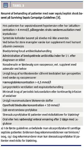 Behandlingen af svær sepsis og septisk shock er således i dag baseret på disse internationale kliniske retningslinjer, som senest blev opdateret i 2012 [3]. De er udarbejdet af en international konsensuskomite bestående af 68 eksperter fra 30 internationale organisationer/videnskabelige selskaber. Anbefalingerne, som er udarbejdet på basis af den foreliggende litteratur, grad af evidens og konsensus blandt eksperterne, repræsenterer bedste praksis og ikke blot standardbehandling. Rekommandationerne er gradueret på basis af kvaliteten af den foreliggende evidens (A, B, C og D) hvor A er højest og D lavest. Styrken af rekommandationer angives endvidere som stærk [1] eller svag [2]. Generelt er intensivterapi karakteriseret ved lav grad af evidens, dette gælder også for behandling af patienter med sepsis. Surviving Sepsis Campaign Guidelines (Tabel 3) er kun i beskeden grad evidensbaseret, men kampagnen har bidraget til, at der er kommet øget opmærksomhed på patienter med sepsis. Tidlig opsporing af sepsis og tidlig indsættende behandling er afgørende for prognosen.