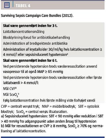 Foruden de diagnostiske kriterier og behandlingsanvisninger beskrives der i Surviving Sepsis Campaign Guidelines en »behandlingspakke« med en række procesindikatorer. I den opdaterede version består denne pakke (Surviving Sepsis Campaign Care Bundles) af syv elementer, som skal være opfyldt inden for henholdsvis tre og seks timer. Denne pakke ses i Tabel 4. I december 2012 introducerede Patientsikkert Sygehus i regi af Dansk Selskab for Patientsikkerhed en ny »sepsispakke« som supplement til de eksisterende kliniske retningslinjer. I den nye pakke er der særlig fokus på tidlig opsporing af sepsis på sengeafdelinger for dermed at sikre effektiv behandling af patienter, som er i risiko for at få livstruende infektioner [16]. Ligesom ved en række andre akutte tilstande som akut myokardieinfarkt, apopleksi og multitraumer spiller timing en afgørende rolle for effekten af behandlingen. Septiske patienterne har ofte et rapidt sygdomsforløb, der resulterer i organdysfunktion og i værste fald septisk shock. Patienter med sepsis bør derfor behandles aggressivt og uden forsinkelse. Det er vigtigt, at den modtagende læge er opmærksom på kriterierne for sepsis, svær sepsis og septisk shock. Det er lige så vigtigt, at man uden for intensivafdelingen har et højt beredskab til diagnosticering af svær sepsis og septisk shock. Behandlingen skal påbegyndes så hurtigt som muligt, uanset om patienten er i akutmodtagelsen eller på en sengeafdeling. Første tiltag er ilttilskud, væske i form af krystalloider og – efter dyrkning fra blod og andre relevante medier som spinalvæske, urin og pleuravæske – antibiotikabehandling.