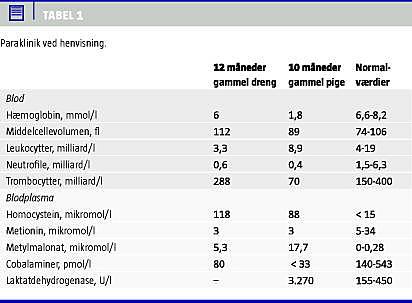 II. En ti måneder gammel pige blev indlagt akut på grund af vægttab og tab af motoriske færdigheder. Hendes udvikling havde været normal indtil en måned før indlæggelsen. Barnet var brysternæret med forsøg på tilskud af fast føde i relation til aktuelle sygdomsperiode. Begge forældre var veganere både med hensyn til egen og barnets kost og tog intet vitamintilskud. Barnet var voksblegt, febrilt og hypotont. Blodprøver viste pancytopeni. Retikulocyttal, p-jern og p-ferritin var normale, og laktatdehydrogenase var svært forhøjet (Tabel 1). Behandling for urosepsis samt erytrocyttransfusioner blev institueret. Supplerende undersøgelser viste B12 -mangel med lav p-metionin, forhøjet p-totalhomocystein og p-metylmalonat samt homocystein- og metylmalonsyreudskillelse i urinen (Tabel 1). Knoglemarven viste udtalt megaloblastær anæmi. Moderens p-cobalaminer var 105 pmol/l. Barnet udviklede flere generaliserede krampeanfald. Elektroencefalogram var normalt. Computertomografi af cerebrum viste let central og kortikal atrofi.