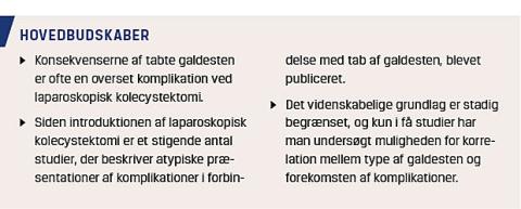 Tabte efterladte galdesten kan føre til en lang række af komplikationer, der kan indtræde fra få dage til flere år efter LK. Hyppigst udvikles der intraabdominale abscesser og fistler, men tabte galdesten er også årsag til torakale, bækkenrelaterede og øvrige abdominale komplikationer. Patienter, der indstilles til LK, bør informeres om risici ved tab af galdesten og mulige komplikationer, og kirurger bør gøre sig umage for at undgå iatrogen galdeblæreperforation og tab af galdesten.