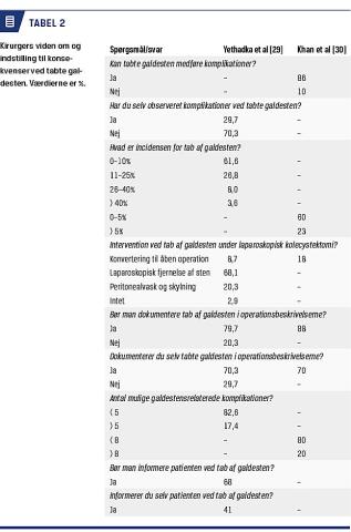 I to studier, hvor man undersøgte kirurgers kendskab og indstilling til risiko for tab af galdesten og dertilhørende komplikationer, fandt man, at en stor andel af de adspurgte (80-83%) underestimerede antallet af potentielle komplikationer (Tabel 2) [29, 30]. Studierne inkluderede hhv. 138 og 82 læger, hvoraf 16-28% var overlæger, mens resten var under uddannelse i kirurgi. I et studie kendte 10% af kirurgerne slet ikke til muligheden for komplikationer i forbindelse med tabte galdesten [30]. Endvidere svarede 80-88% af de adspurgte, at tab af galdesten under LK burde inkluderes i operationsbeskrivelserne, men kun 70% gjorde dette i praksis. Ydermere svarede kun 41%, at de informerede patienten i tilfælde af tabte galdesten [29]. På trods af at begge studier er små, indikerer resultaterne, at kirurger generelt har utilstrækkelig fokus på tab af galdesten og de dertilhørende mulige komplikationer. og øvrige abdominale komplikationer.