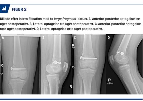 Man forsøgte først lukket reponering i generel anæstesi, hvilket ikke var muligt. Man konverterede til lateral parapatellar adgang, hvor frakturen kunne fritlægges. Efter massiv oprensning for periost i frakturspalten blev frakturen reponeret anatomisk. Stillingen blev kontrolleret palpatorisk og radiologisk på operationsstuen. Efter reponeringen var der ingen mistanke om kar- eller nerveskade. Frakturen blev internt fikseret med to large fragment-AO-skruer (Figur 2). Knæet blev efterfølgende fundet side-, skuffe- og Lachmann-stabilt på operationslejet.