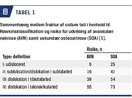 Tabel 1 viser sammenhængen mellem frakturtype og risikoen for udvikling af avaskulær nekrose og sekundær osteoartrose. Tabellen er baseret på poolede data fra mindre, retrospektive serier og er derfor forbundet med en vis usikkerhed [2].