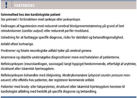 Svimmelhed på baggrund af hjertesygdom ses primært som led i nærsynkope eller synkope og vil oftest kræve nærmere udredning, for at man kan fastlægge den specifikke diagnose, risikoen for dødsfald og behandlingsmulighederne. I denne artikel vil vi fokusere på svimmelhed som led i nærsynkope eller synkope, i engelsksproget litteratur ofte betegnet som transient loss of consciousness eller loss of consciousness [1, 2].