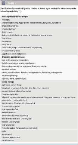 I baggrundsbefolkningen er reflekssynkope (neurokardiogen) eller vasovagal synkope den hyppigst forekommende, efterfulgt af tilfælde betinget af arytmier. Patofysiologien afhænger i høj grad af alderen. Børn og unge rammes oftest af reflekssynkope eller arytmier, f.eks. Wolf-Parkinson-Whites syndrom eller arveligt betingede arytmier. Hos midaldrende patienter forekommer reflekssynkope fortsat hyppigt og kan ses i forbindelse med vandladning, defækation og hoste. Hos ældre patienter forårsages symptomerne hyppigt af nedsat minutvolumen på grund af obstruktion, f.eks. ved aortastenose eller som følge af primære hjerterytmeforstyrrelser eller af arytmier udløst af iskæmisk hjertesygdom. Tabel 1 indeholder en patofysiologisk klassifikation af synkope, jf. seneste europæiske behandlingsvejledning i let revideret form [1].