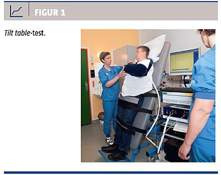Tilt table-testen bruges i diagnosticeringen af den neurokardiogene synkope og til nærmere karakterisering af den neurokardiogene synkope som kardioinhibitorisk (bradykardi) eller vasoinhibitorisk (hypotension) eller en blanding heraf. Testen udføres efter standardiserede protokoller, hvor patienten anbringes på et vippeleje i ca. 30 minutter, hvorefter der udføres en head-up tilt på 60-70° under registrering af hjerterytme og blodtryk (Figur 1). Testen er positiv, hvis der induceres symptomatisk hypotension eller bradykardi. Testen er ikke forbundet med risiko, men er en specialistopgave [6, 7].
