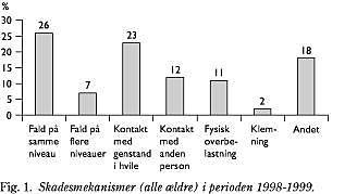 Af Fig. 1 fremgår skadesmekanismerne for alle aldersgrupper under et. Gruppen af 0-14-årige, som tegnede sig for ca. 60% af alle skader, havde en lidt anderledes procentuel-fordeling af skadesmekanismer, idet fald på samme niveau og klemning udgjorde en lidt større del af skaderne, mens fysisk overbelastning som forventeligt udgjorde en noget mindre del. Dvs. at fald på samme niveau og klemning var overrepræsenteret som skadesmekanisme hos de 0-14-årige, mens fysisk overbelastning var en underrepræsenteret skadesmekanisme hos disse.