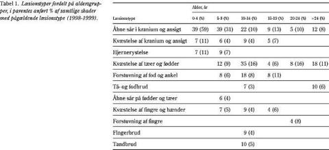 Resultater: I opgørelsesperioden fandtes gennemsnitlig 349 skader/år, svarende til en incidensrate på 50/100.000. Der registreredes en betydelig dominans af de yngste aldersgrupper blandt de tilskadekomne. De 0-14-årige udgjorde 60% af de tilskadekomne. Den dominerende skadesmekanisme var fald på samme niveau. Læsionstyperne varierede med alderen.