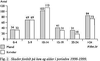 I Fig. 2 er skaderne opdelt efter køn for de forskellige aldersgrupper. Der syntes at være tale om mindre kønsforskelle i antallet af skader. Der var således en ikkesignifikant forskel i skadeshyppighed kønnene imellem (t-test: p > 0,4) for alle aldersgrupper taget under et i den opgjorte periode.
