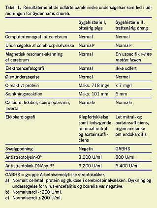 II. En 13-årig, tidligere rask dreng blev indlagt på mistanke om Tourettes sygdom. I løbet af 2-3 uger havde han fået ufrivillige spjættende bevægelser primært af højre arm og ben samt ufrivillige bevægelser af tunge og mund. Talen var langsom og »snøvlende«.