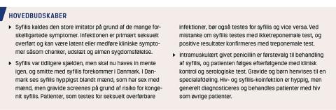 Syphilis is a sexually transmitted infection caused by the spirochaete Treponema pallidum. Syphilis re-emerged worldwide in the late 1990s, and hereafter increasing rates of syphilis were seen also in Denmark. Currently, around 700 cases are diagnosed yearly in Denmark, and syphilis is mainly encountered among men, who have sex with men. However, because of the risk of congenital infection screening of pregnant women has been introduced. Syphilis gives rise to highly variable symptoms such as chancre, skin rashes and fever or latent infection. The recommended treatment is intramuscular administration of penicillin.