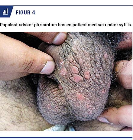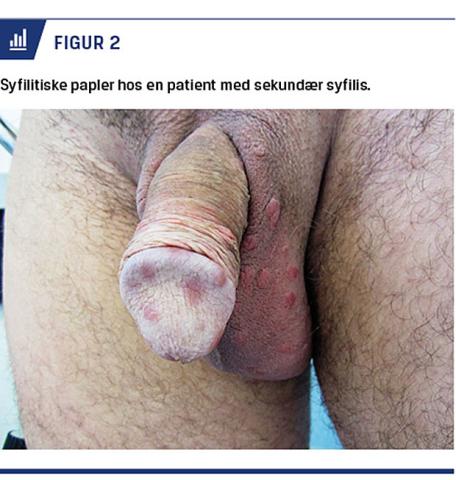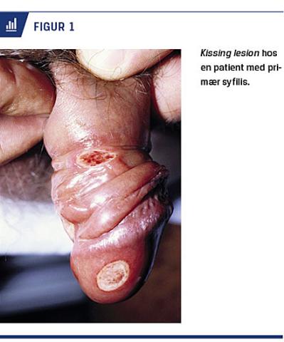 Syfilis er blevet kaldt den store imitator på grund af de mange forskelligartede kliniske symptomer og multiple sygdomsstadier. Diagnostikken kompliceres af, at de kliniske stadier kan være overlappende, men teoretisk opdeles syfilis i fire stadier: primær, sekundær, latent og tertiær syfilis. Primær syfilis er karakteriseret af chankere, uømme, indurerede sår med eleverede randzoner (Figur 1). Såret findes oftest på genitalierne, vaginalt, perianalt, rektalt eller i munden/svælget, opstår på stedet for inokulationen 9-90 dage efter smitte og heler spontant efter 3-8 uger. En chanker på slimhinder opdages ikke nødvendigvis af patienten selv. Der kan desuden ses multiple chankere og herpetiforme læsioner i primærstadiet [10]. Samtidig uøm, regional lymfadenitis ses hos 70-80%.