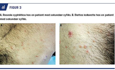 Ubehandlet primær syfilis kan progrediere til sekundær syfilis med systemiske manifestationer såsom almen sygdomsfølelse, feber, lymfadenitis, blegrødt makulopapuløst udslæt (roseola syphilitica) på huden samt papler i håndflader og på fodsåler (Figur 2, Figur 3 og Figur 4). På slimhinder og fugtige områder af huden kan der ses condyloma lata (bredbasede hypertrofiske væskende papler). Symptomerne forekommer typisk seks uger efter den primære chanker. Hepatitis, periostitis, artritis og glomerulonefritis kan ligeledes ses ved sekundær syfilis [10]. Den klassiske differentialdiagnose til sekundær syfilis er pityriasis rosea. Udslættet i sekundærstadiet kan også være papuløst og ligne guttat psoriasis, ligesom det kan være annulært.