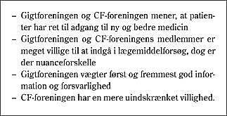 Det må forventes, at jo mere livstruende en sygdom patienten har, jo større er risikovilligheden. Med dette udgangspunkt vil vi i det følgende redegøre for de nuanceforskelle, der er i Gigtforeningens og Cystisk Fibrose-foreningens holdninger til afprøvning af nye lægemidler.