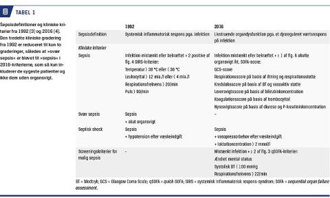 Både definitionen og de kliniske kriterier for sepsis er ændret i 2016- i forhold til 1992-versionen (Tabel 1). Kriterierne er forenklet således, at der nu er fokus på akut organsvigt og kun to graderinger, sepsis og